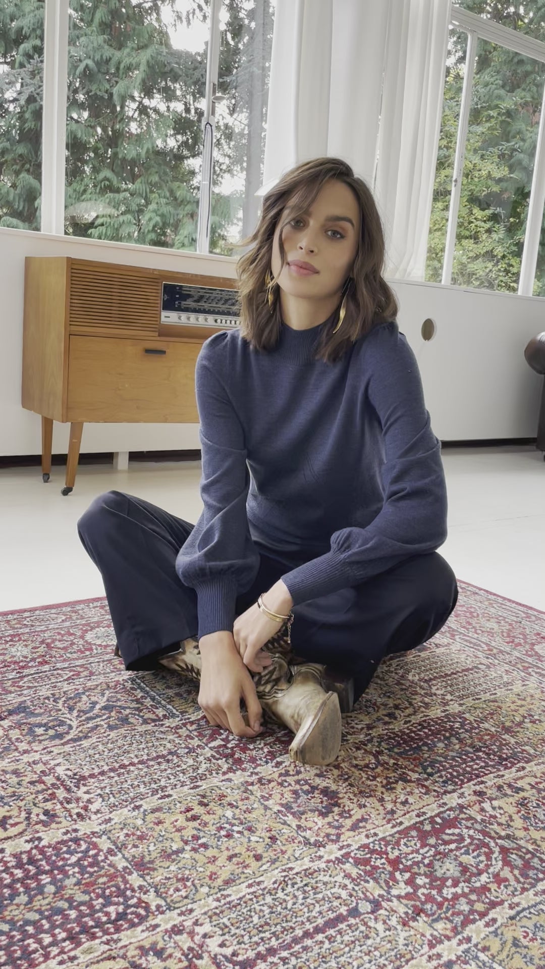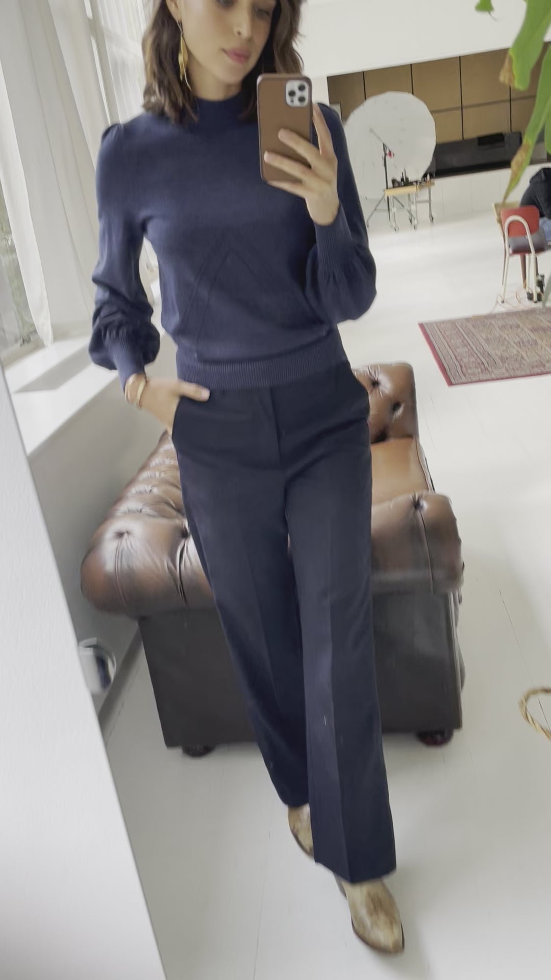 Maatadvies// De trui valt iets losser zoals je ziet, dat vinden wij mooi. Als jij ‘m ook zo wilt dragen, bestel dan je reguliere maat.