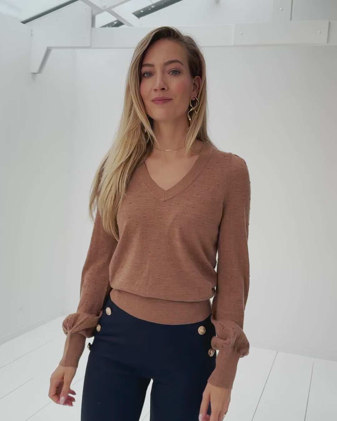 Met deze prachtige camel kleurige V-hals trui van merinowol zijn we we helemaal in onze nopjes – en jij straks ook! Het verfijnde noppenstructuurtje knipoogt schalks naar de iconische polkadot, dus met iconische klasse zit het wel goed – net als met de extrafijne merinowol waarvan dit mooie truitje is gebreid: die blijft eindeloos lang mooi met een minimum aan onderhoud. Nice!