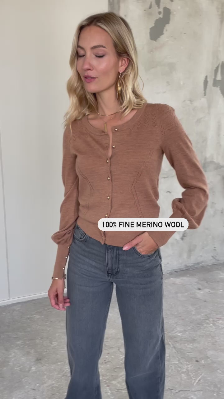 Cute as a button! Cardigan FRAGANCE is a huge flirt. She charms you with her beautiful matte gold buttons, feminine puff sleeves and seductive ajour stitch lines. Fine-knit from 100% soft merino wool that wears wonderfully, does not itch and fits like a dream: the blousy fit is pleasantly forgiving and can be worn on your skin, or layered over a top. Did we mention that the cardigan can also be worn as a sweater? What a beauty!