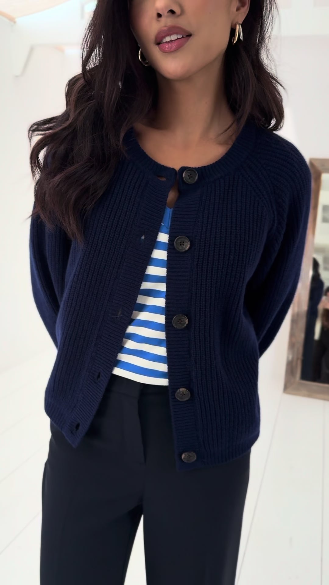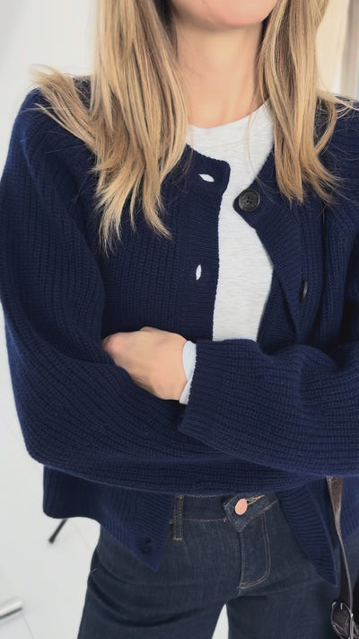 Calling all cardigan lovers. Cardigan LA LYON is knitted from a fuller-feeling merino yarn, in a 'cardigan stitch' that not only gives the knit texture but also keeps it in nice shape. See the flamed contrast buttons and the puff above the cuff, and you'll be completely sold: this is a wannahave to never take off.