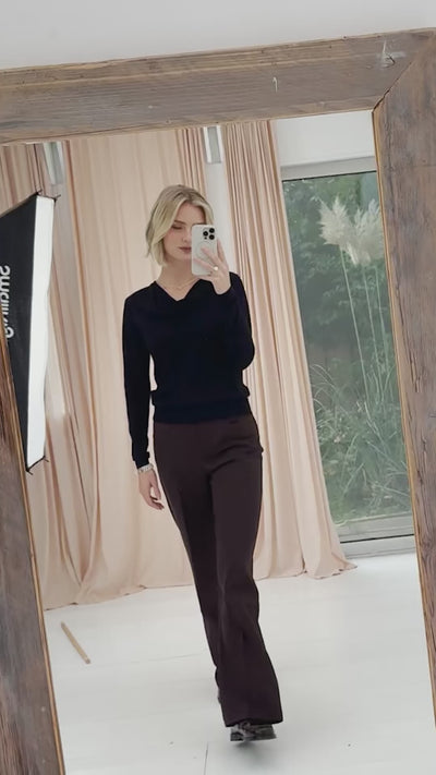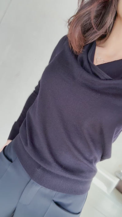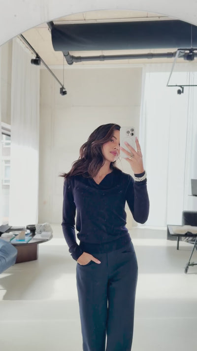 Our fine-knit merino wool is about to get “fancy”. Because ohlala what a difference the waterfall neckline of sweater LA CASCADE makes! The supple drape automatically gives you an elegant swan neckline, and if you wear a blazer or thick cardigan over it, the beautiful neckline stays visible. As you probably know, you can wear our non-fussy merino wool directly on the skin.