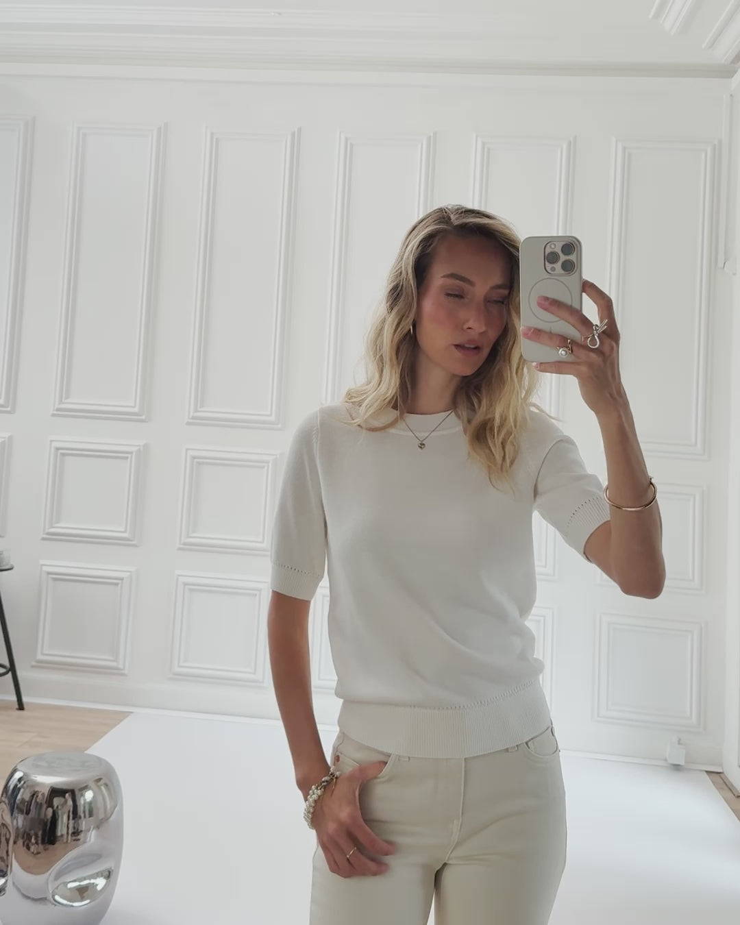 Is 'sporty elegance' jouw droomstijl? Trui LA RÊVE pampert je zintuigen met een iets grover breisel in een luxe blend met zachte katoen én - we kunnen het niet laten - een royale scheut merinowol. No worries, merinowol draagt dankzij de temperatuur-regulerende eigenschappen elk seizoen comfortabel. De iets langere korte mouwen (tegenstrijdig, maar het werkt) staan super-flatterend.