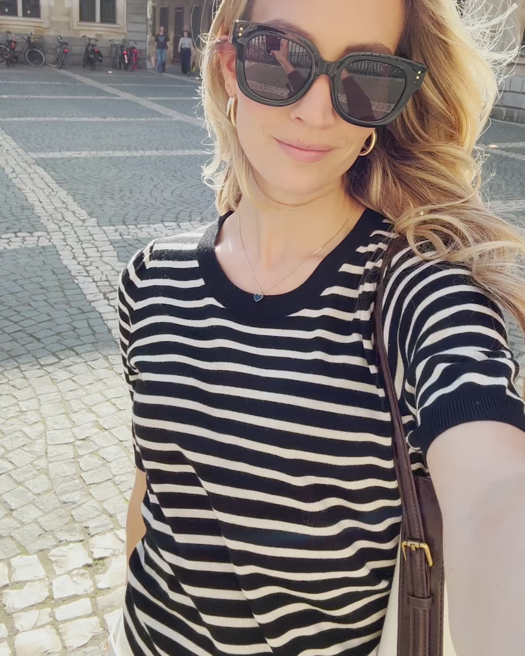 We zetten een streep door het begrip 'seizoenskleding': merinowol draag je het hele jaar door. Het geheim: temperatuur-regulerende eigenschappen die je comfortabel houden, no matter the season. Fijngebreid streeptruitje LA MILOU is een classic cutie, of je haar nu solo draagt of gelaagd onder een blazer of vest.