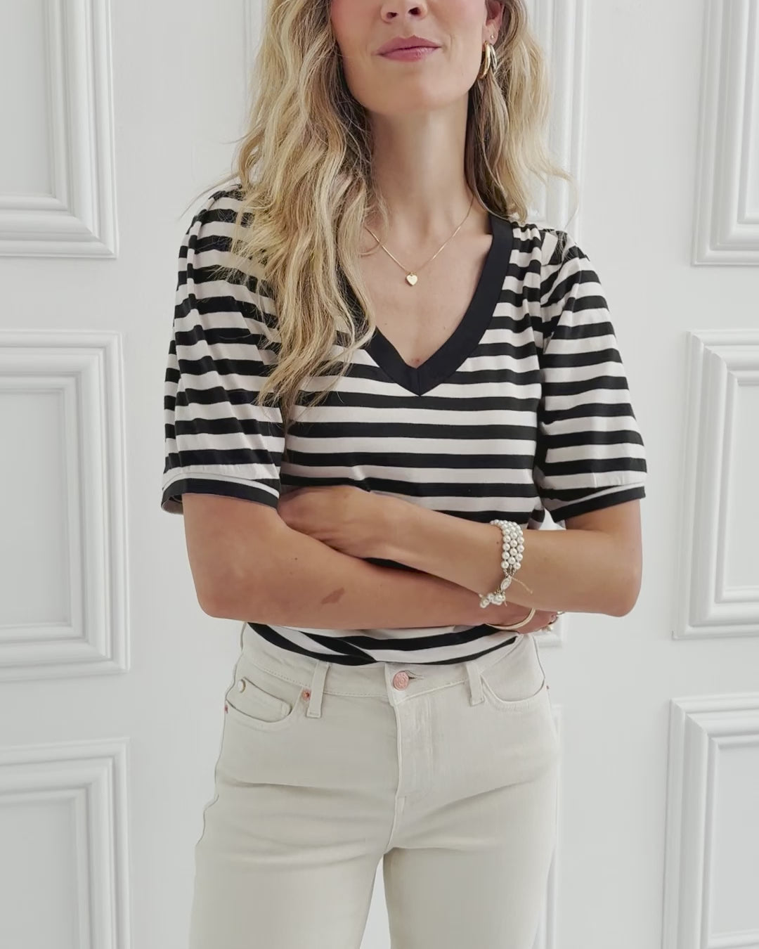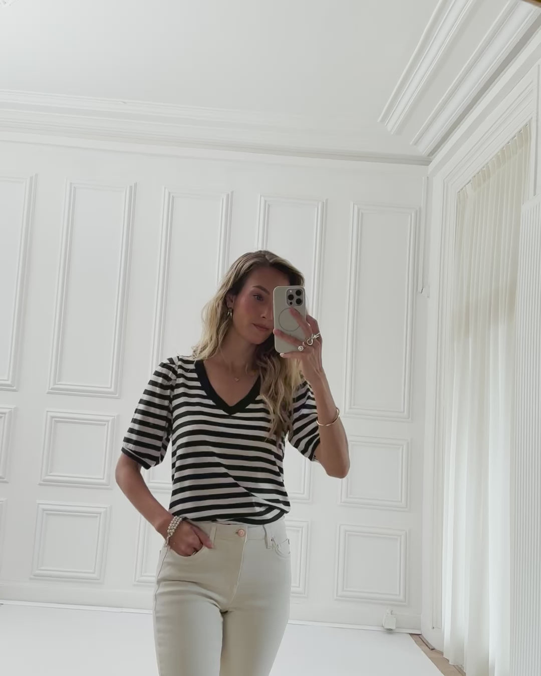 De straten van Parijs, waar de lente en masse gestreepte T-shirts naar buiten lokt. Eerlijk waar, niet te tellen! T-shirt LA MAYSE geeft je met haar vrouwelijke pofmouwen en elegante V-hals de iconische looks van une vraie Parisienne.