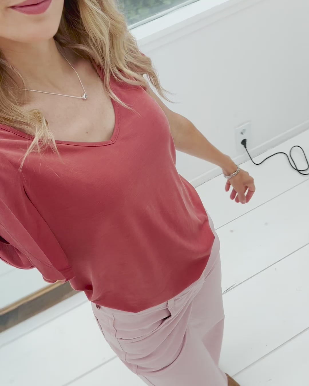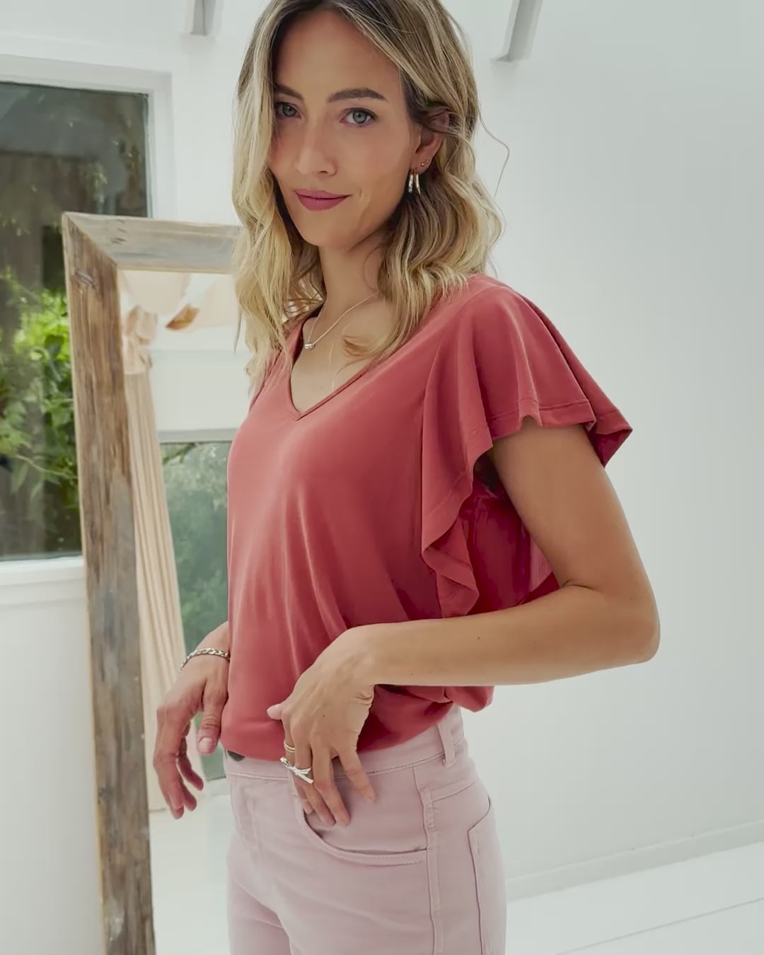Gespot: een geboren hoogvlieger! De elegante vlindermouwen maken top LA FIORA ultiem vrouwelijk, net als de wijde ronde hals die we nét geen boothals mogen noemen. De jersey blend met duurzaam geproduceerde modal - het high-end 'zusje' van viscose - valt prachtig sluik en soepel zonder aan je contouren te 'kleven'. De licht aangesloten pasvorm maakt LA FIORA geschikt om zowel óver als í de tailleband te stylen. Nog een pluspunt: met wijde ronde hals aan de ene zijde en V-hals aan de andere zijde ; op 2 manieren te dragen!